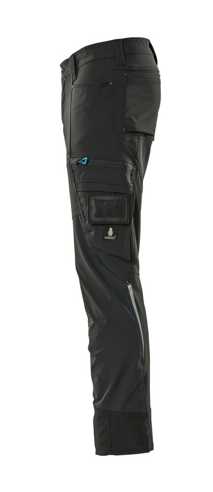 Har en vandafvisende finish. Ultimativt strækstof med lav vægt og høj slidstyrke. Stoffet mærkes nærmest ikke mod huden, da lommerne er integrerede i designet. Tonålssømme på ben og i skridt. Bukseben er ergonomisk formede. Bæltestropper. Gylp med lynlås. Forlommer. Baglommer. Lårlommer i venstre side – en med klap og magnetlukning og en med lynlås. Lårlommer i højre side – en med knivlomme i CORDURA® og en med lynlås. Elastikregulering ved fod. Forstærkninger på dele af produktet.